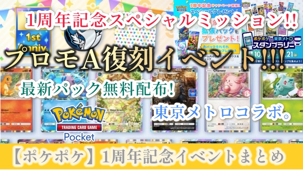 今回はポケポケで2025年10月30日(木)より順次開催される『メガライジング無料配布』『1周年記念スペシャルミッション』『プロモカード復刻イベント』『東京メトロタイアップキャンペーン』等の1周年記念イベントについてまとめてお伝えしていきます!