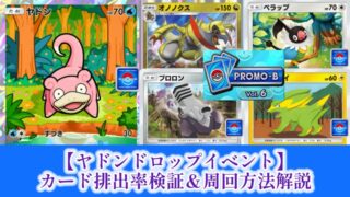 プロモカード 【ポケポケ】ヤドンドロップイベント/カード排出率検証&周回デッキ解説【プロモパックB vol.6】 今回は2026年4月9日(木)15:00~4月19日(日)14:59まで開催されているポケポケ/シャイニングメガ(B2b)環境の期間限定イベント『ヤドンドロップイベント』の効率的なオート周回方法解説&【プロモパックB vol.6(全5種)】カードの各種2枚入手達成時の排出率を検証していきます! 2026.04.09 プロモカードポケポケ
