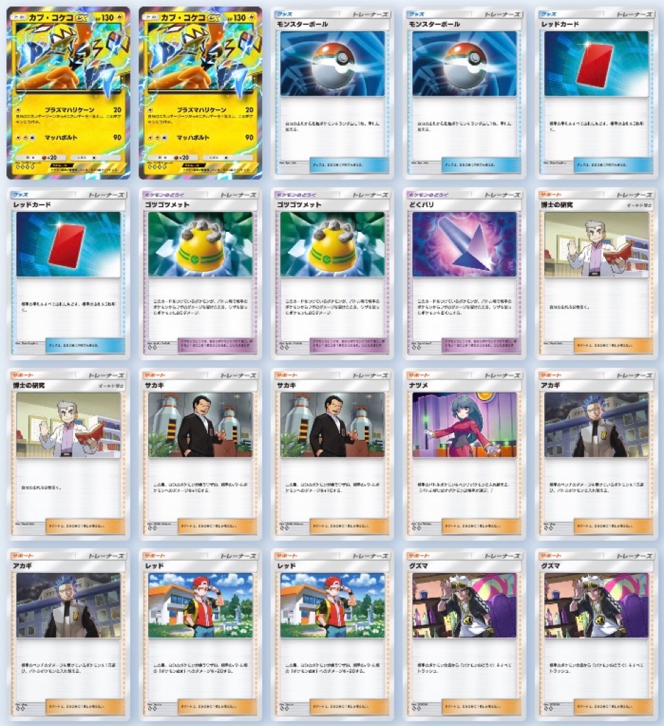 他には相手の『大きなマント A2』1枚に対して『グズマ A3』2枚採用は過剰に感じるかもしれませんが、メガラティオスexに付けられるとHPを200にされカプ・コケコexで3回殴らなければならずその間にエネを溜められて負けるパターンが超ダルいので2枚採用をおすすめします…っ!