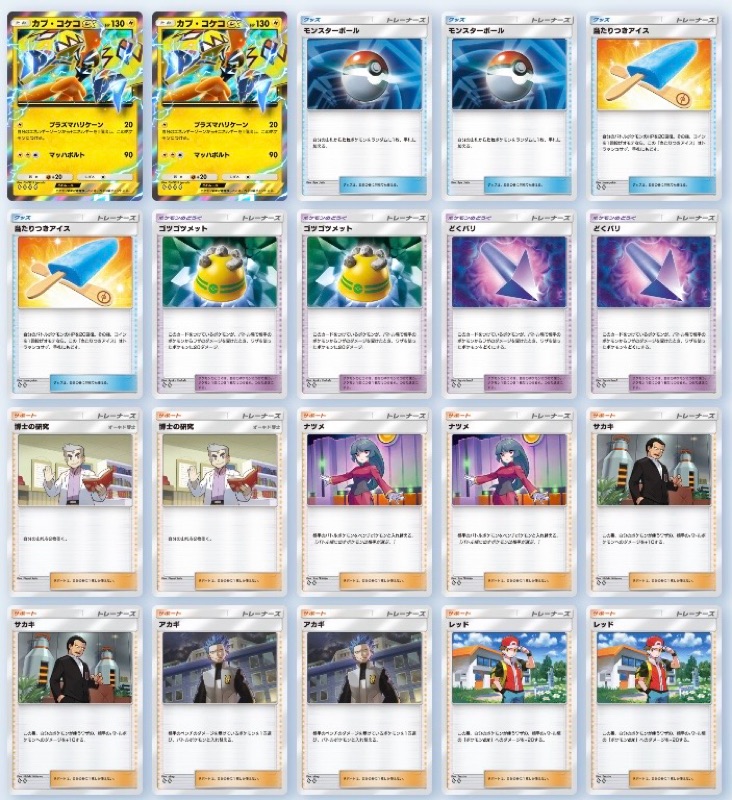 ちなみに、相手にカスミが採用されている為、不意に1体目のカプ・コケコが倒されるリスクが少なからずあるのでカプ・コケコexを出来るだけはやく手札に収めておくためにも『モンスターボール』2枚採用は必須と考えています。