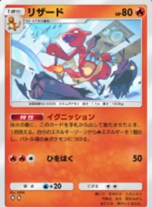 | HP80 特性 イグニッション 自分の番に、このカードを手札から出して進化させたとき、1回使える。自分のバトル場の炎ポケモンに炎エネルギーを1個つける 【技】 炎②無色①:ひをはく 50 弱点:水 逃げるエネルギー:無色② |