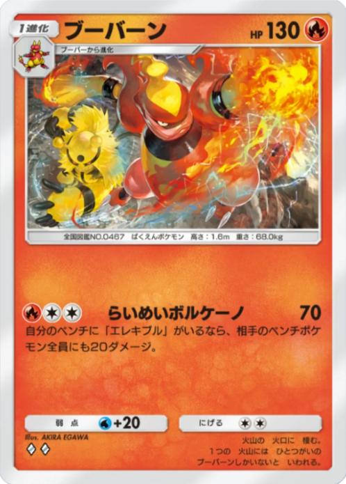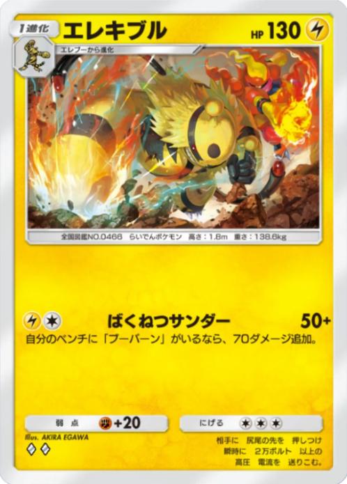 お互いが場にいるという特殊な条件をクリアすることで、どちらも非ex1進化の持つワザとしてはハイスペックな内容に変化し、デッキとしても時空の激闘産のエネ加速ができる『ブーバー』&雷エネをベンチに付け替えられる『エレキコード』を上手く使えば十分戦っていけるものとなります。