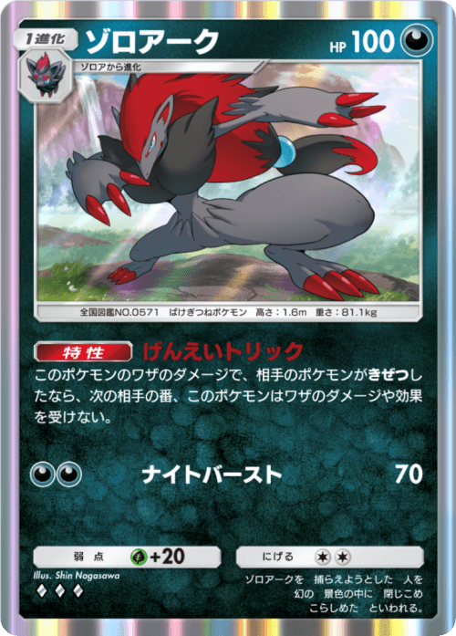 ①エネで相手の場のエネの数だけ青天井にダメージを伸ばせるコスパの良い1進化となってはいるものの、無敵になれる未知なる水域産の『ゾロアーク』の方が優れているのが何とも悲しい1枚。