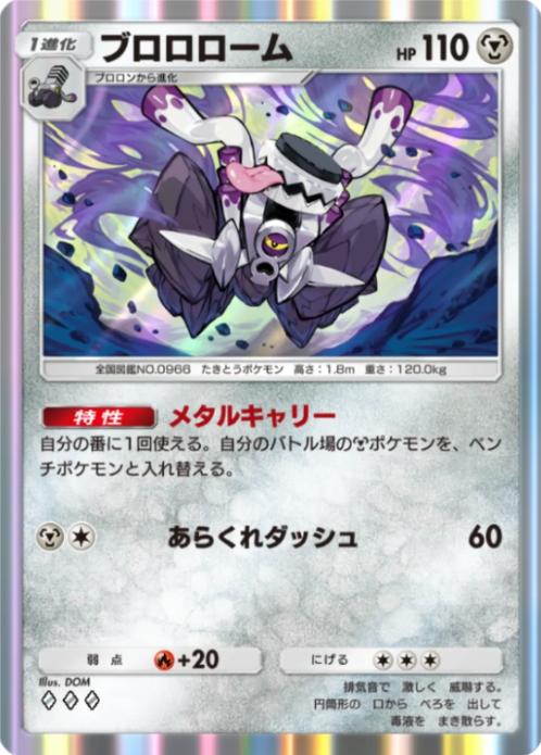 ③エネ必要なのが若干厳しい所ですが、組み合わせるブロロロームがHP110と非exにしては高耐久で、更に鋼タイプには状態異常を無効化できる『鋼鉄のまえかけ』や、ダメージを大幅カットできる『メタルコアバリア』等の超優秀な耐久道具が用意されており、耐久している間にエネを貯めることも可能となっています!