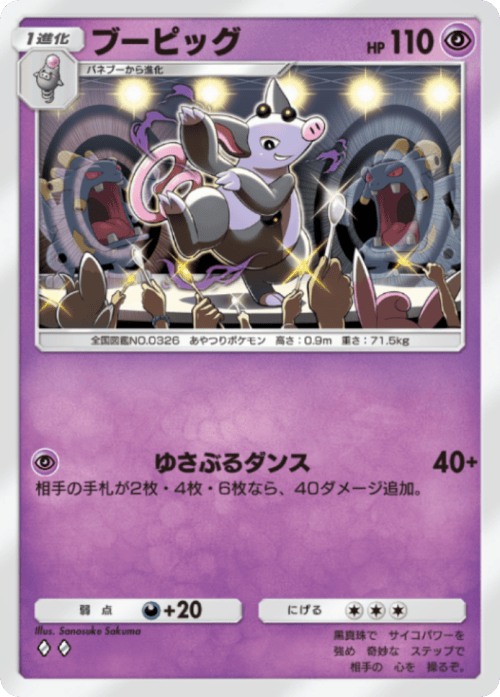 相手に手札が4枚になるように捨てさせられるのが強力で、更に同じシャイニングメガに収録されている『ブーピッグ』を確定で①エネ80打点ポケモンとして活用可能になる妨害系グッズ。