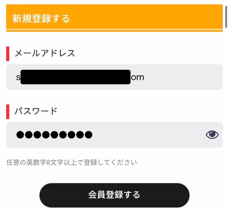 下にスクロールしていくと「新規登録する」という項目がでてくるので任意のメール&パスワードを打ち込んで『会員登録する』をタップして次のページに移ります。