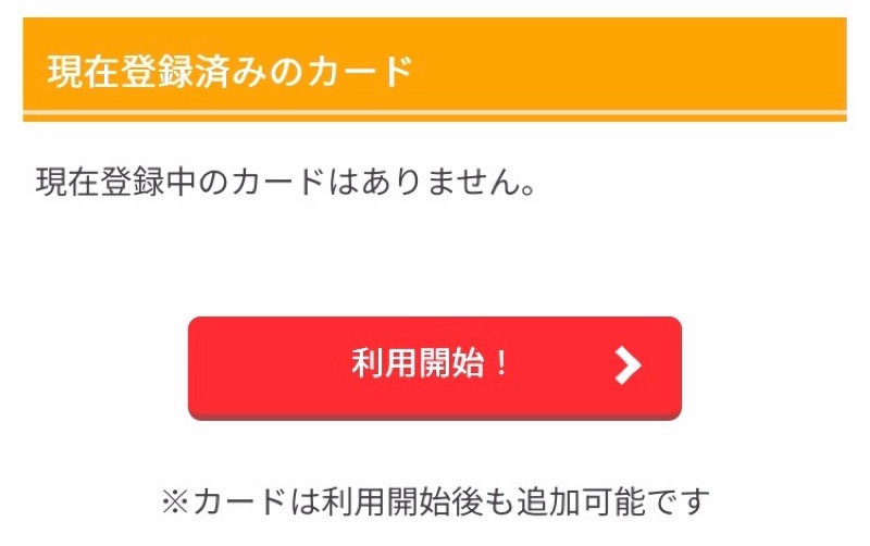 『初回カード登録』画面からもう少し下にスクロールすると『利用開始!』のボタンが出て来るのでタップします。