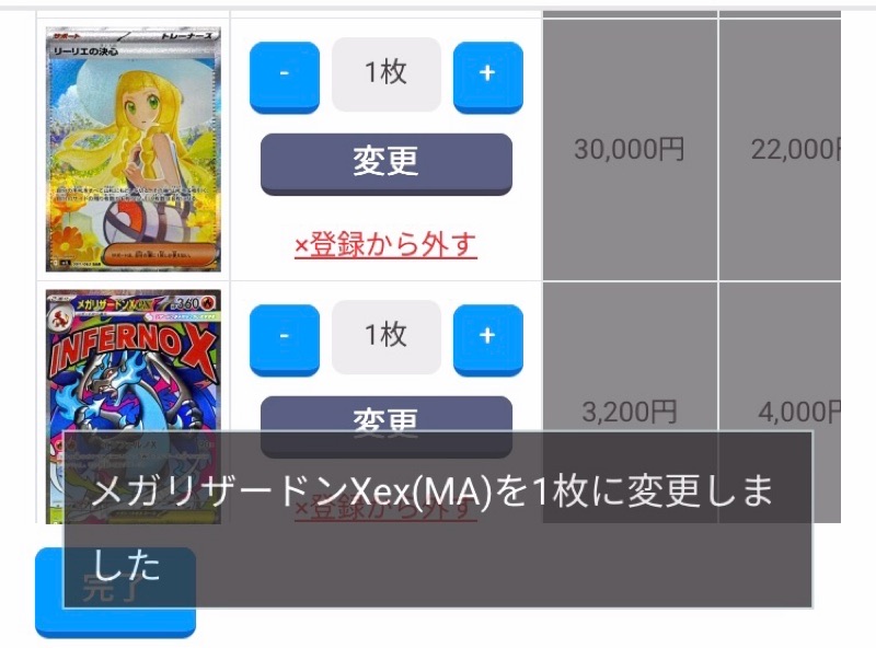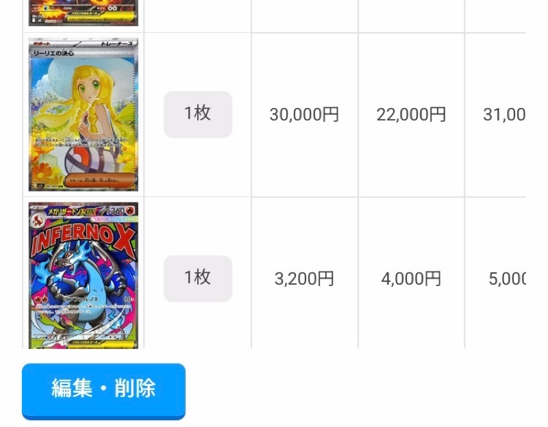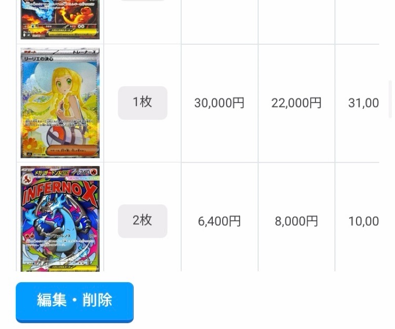 例えば、本来自身が所持する「メガリザードンXex MA」が1枚であるにも関わらず所持枚数を「2枚」で登録していることを発見した場合は『編集・削除』ボタンをタップする。
