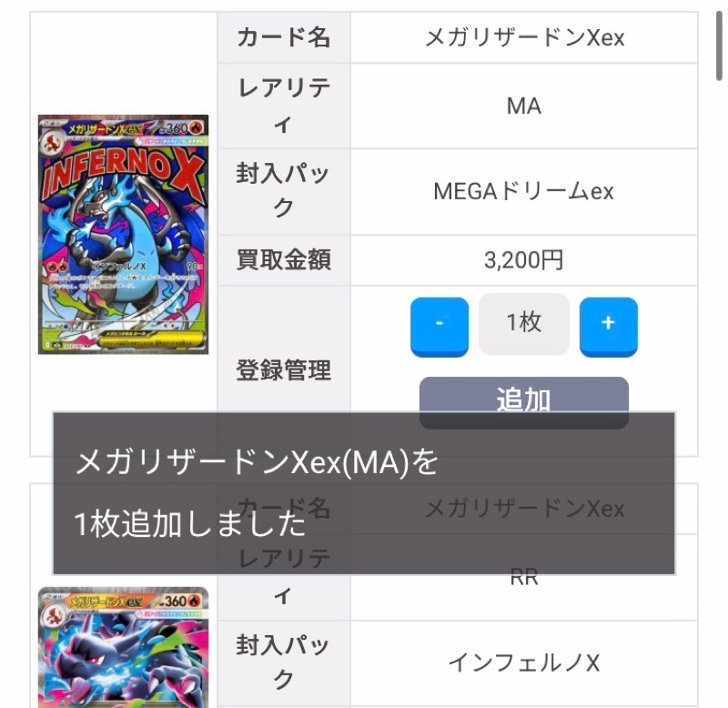 そして該当カードの画像や情報を確認自分の所持枚数に合わせて枚数を調節し『追加』ボタンをタップして登録する。