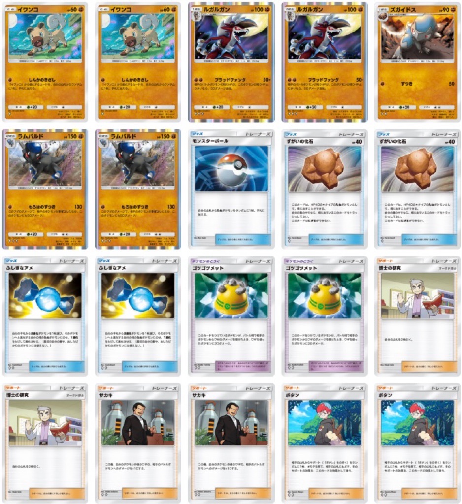 また、上記のデッキは約50%の確率で博士の研究になる『ボタン A3b』等を活用してルガルガンやラムパルドを安定して建てるデッキであり、実際安定して進化可能なのですが、それでも進化事故の可能性は若干はあります。